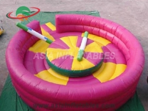 Two players Joust from elevated inflatable platforms with foam jousting sticks. The last person standing wins! The jousting poles are made of foam and the participants wear protective headgear. The other person lands on the inflatable cushion for a soft landing. The inflatable joust arena is a great unit for your company party, corporate event, after prom bash, school event, church events, or any backyard looking for exciting fun. Also check out our inflatable wrecking ball and twister mats as well. These inflatables are great for any age group.